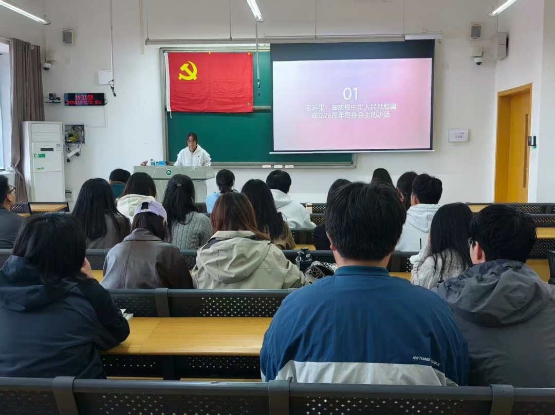 首先,梁露月同志带领大家一起学习了习近平总书记在庆祝中华人民共和国成立76周年招待会上的重要讲话。讲话首先强调了党和国家各项事业取得的新进展,接着提出新征程上党和国家坚持的方针政策及下一步发展规划,激励各位党员同志始终团结在党中央周围,坚持锐意进取、埋头苦干的精神。
