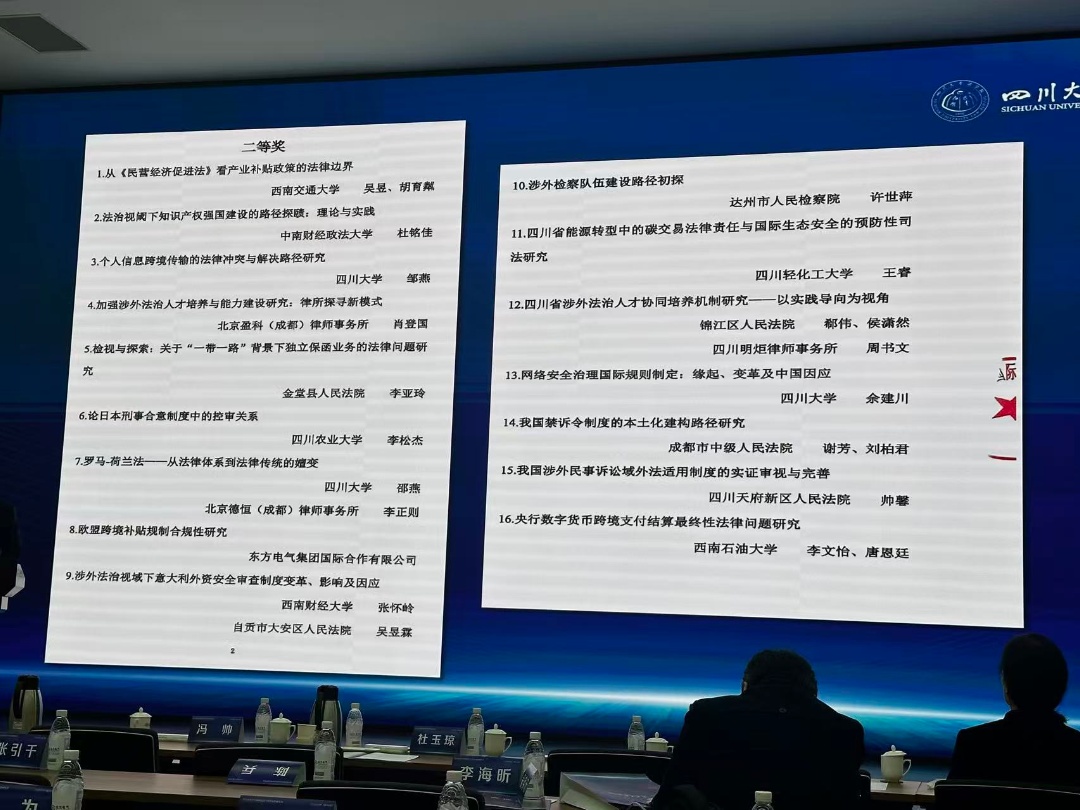 主题研讨环节,与会专家、学者围绕“域外法查明机制的优化”“网络安全国际规则”“外籍人员网络社交账号纠纷”“《中华人民共和国民营经济促进法》与产业补贴”“东南亚能源投资风险”“国际工程风险控制”“临时仲裁制度的机遇与挑战”等多个热点与前沿法律问题进行了深入交流与讨论。我校法学院教师王睿在研讨中以“四川碳市:责任与司法新防线”为题,分析了四川依托丰富水电资源推动能源转型所面临的高载能产业碳锁定、碳市场制度不完善等挑战,认为应通过预防性司法与碳市场责任机制相融合,完善数据监管与跨境互认,推动企业碳合规体系建设,以司法创新保障区域低碳转型与生态安全。该专题报告受到与会者的积极关注,主题论文获得论坛二等奖。