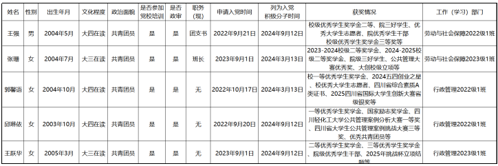 经中共四川轻化工大学法学院学生第二党支部委员会研究,拟吸收王强等5名同志为中共预备党员,现将其基本情况予以公示。在公示期内,欢迎广大党员、干部群众通过信函、电话或直接到党支部或上级党组织反映公示对象思想品质、现实表现、廉洁自律等方面的情况。公示时间为7天(10月28日-11月3日)。