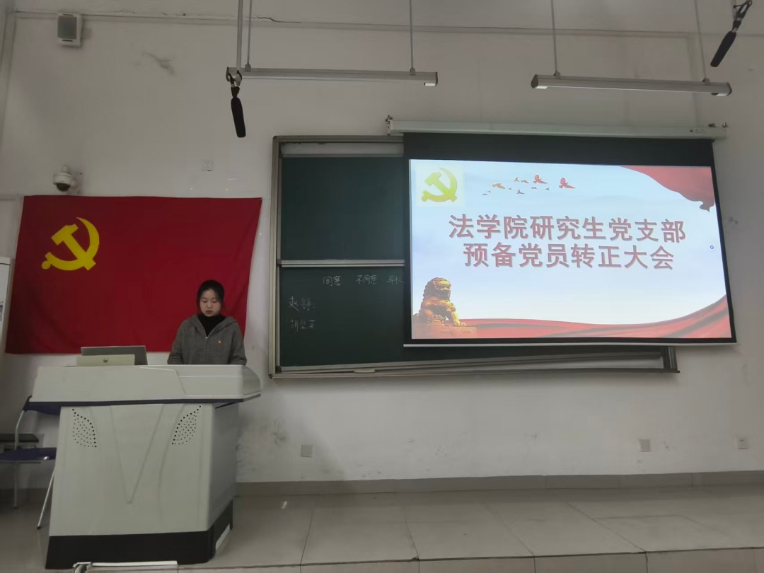 近期,法学院研究生党支部在宜宾校区A1-212教室召开党员发展大会与预备党员转正大会,讨论王雅婕、魏鑫鹏2名同志能否被党组织吸收为预备党员,赵铮、胡壁英2名同志能否按期转正的问题。两次会议共有18名党员参会,支部书记史黎主持本次会议。