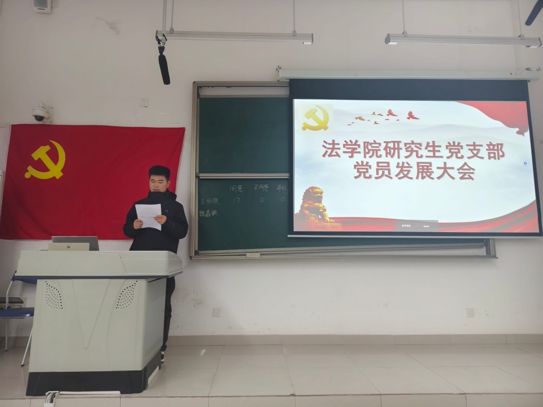 11月13日14:30,法学院研究生党支部在宜宾校区A1-212教室召开预备党员转正大会暨党员发展大会,讨论赵铮、胡壁英2名同志能否按期转正,王雅婕、魏鑫鹏2名同志能否被党组织吸收为预备党员的问题。本次会议共有18名党员参会,支部书记史黎主持本次会议。