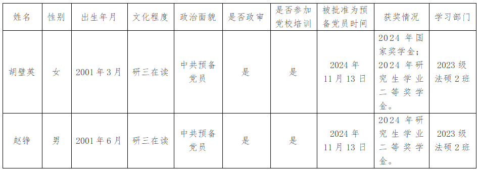 经中共四川轻化工大学法学院研究生支部委员会研究,拟将胡壁英等两名同志转为中共正式党员,现将基本情况予以公示。在公示期内,欢迎广大党员、干部、群众通过信函、电话或直接到党支部或上级党组织反映公示对象在培养考察期间思想品质、现实表现、廉洁自律等方面的情况。公示时间为2025年11月5日至11月11日。
