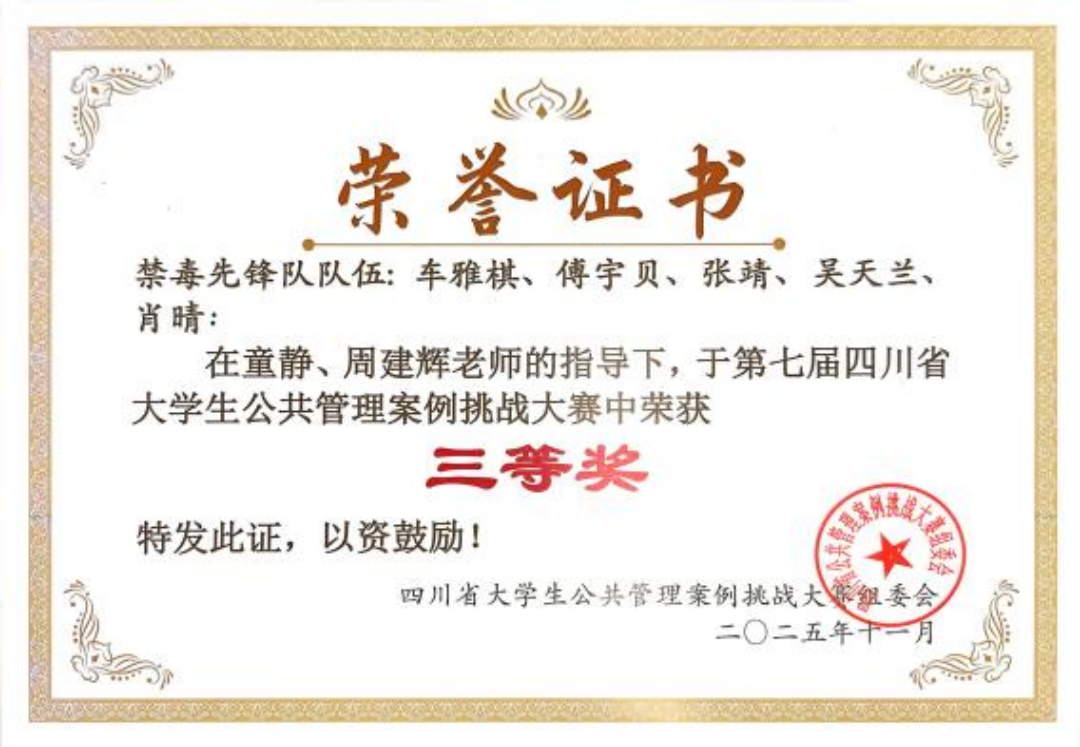 在童静、周建辉的指导下,由2023级法学专业车雅棋(负责人)、傅宇贝、张靖,2023级行政管理专业吴天兰,2023级国际经济与贸易专业肖晴组成的禁毒先锋队,凭借《“坚守的力量”:民族地区禁毒法治教育实践路径探索————以凉山喜德县为例》案例分析报告,荣获大赛三等奖。