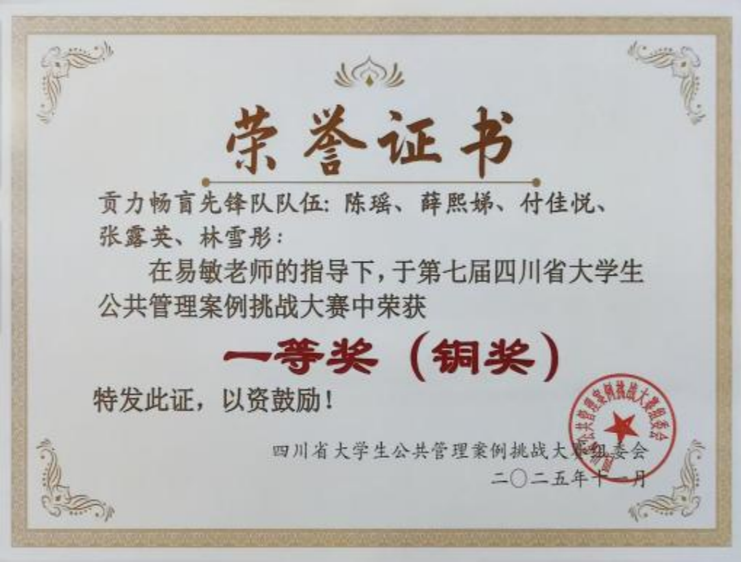 在易敏的指导下,由2024级法学专业陈瑶(负责人)、薛熙娣、付佳悦,2024级行政管理专业张露英、林雪彤组成的“贡力畅盲先锋队”,凭借《迷“盲”人海,公共治理如何点亮黑暗中的迷途?——基于自贡市盲道被占用案例分析》报告,以总分第八的成绩斩获大赛一等奖(铜奖)。