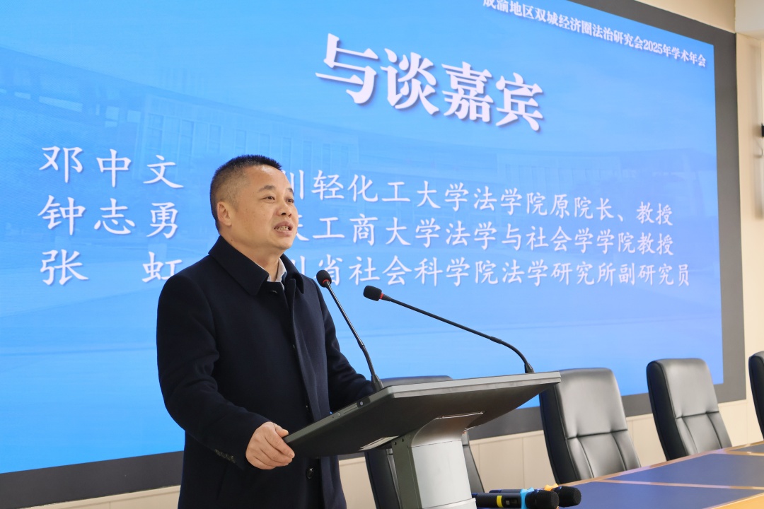 在主旨演讲环节,我院邓中文教授受邀作为与谈嘉宾分享此次年会感悟。与会专家学者分别围绕“都市圈社会治理模式的思考”“成渝地区双城经济圈法治建设的邻水实践——以服务保障川渝高竹新区高质量发展为视角”“公共规制实施中的利益机制”“全体人民共同富裕的成渝步伐之法律初探”“构建粮食产销区省际横向利益补偿机制”等议题作主题演讲。