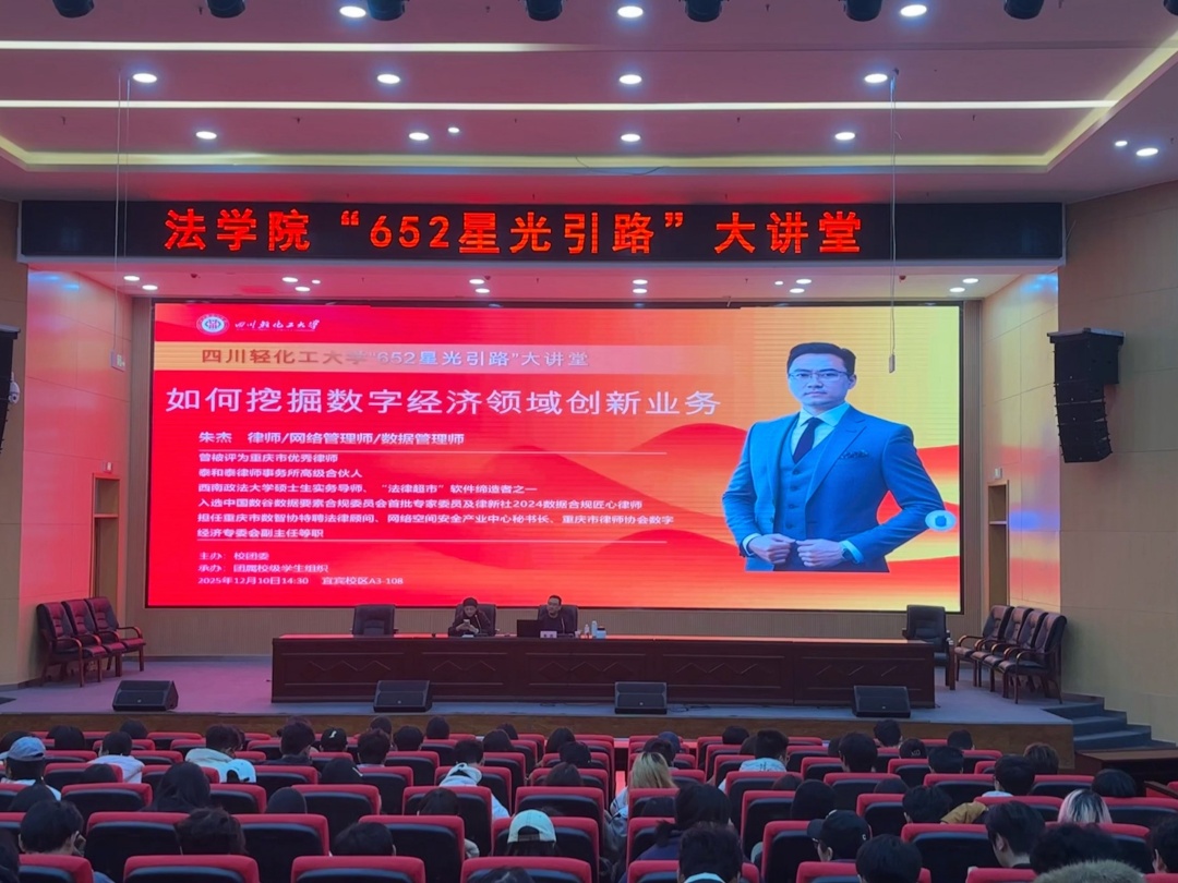 为深化师生对数字经济发展趋势的理解,把握数据要素时代的前沿动态与创新机遇,12月10日14:30,法学院在宜宾校区A3-108举办“652星光引路”大讲堂。本次讲座特邀法学院1997届校友、泰和泰律师事务所高级合伙人朱杰律师担任主讲,我院专职组织员童静主持。