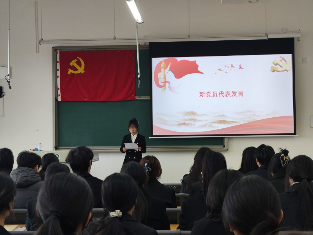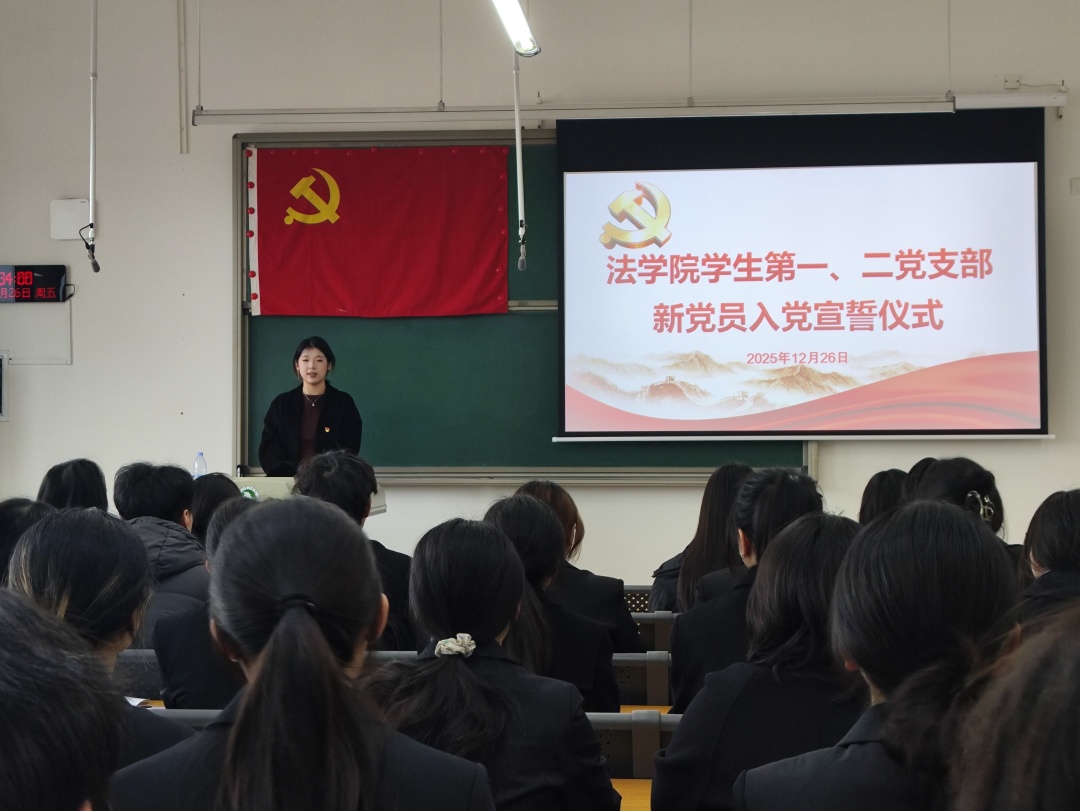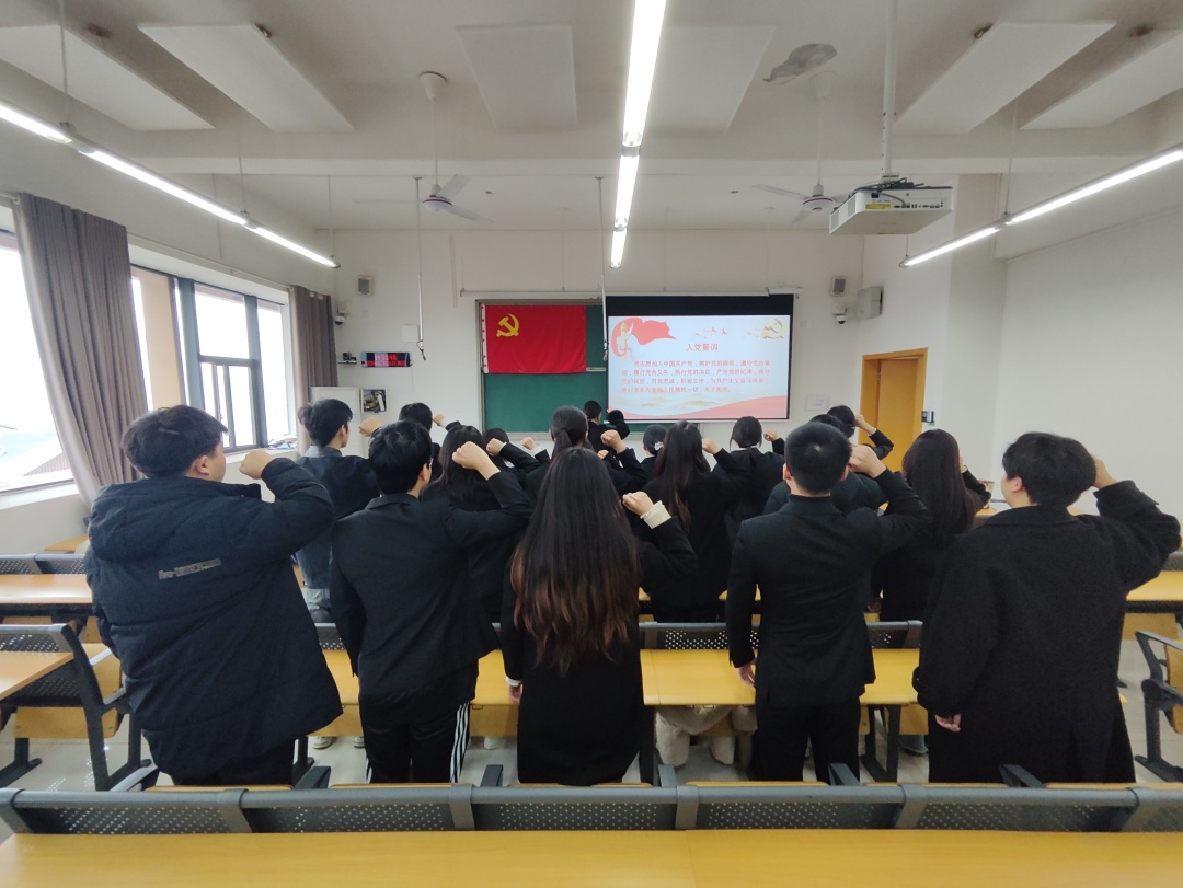 为强化党员党性修养、筑牢信仰之基,引导新发展党员牢记入党初心,增强责任感和使命感,12月26日下午,法学院学生第一党支部和第二党支部在宜宾校区A4教学楼505教室举行新党员入党宣誓仪式。法学院学生第一党支部书记齐光月、学生第二党支部书记段炼及各支部正式党员、预备党员参加。仪式由朱俐蓉同志主持。