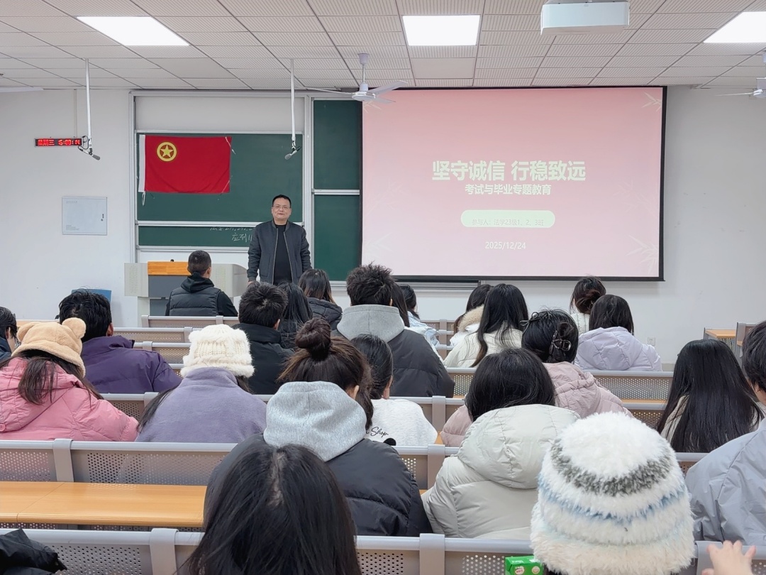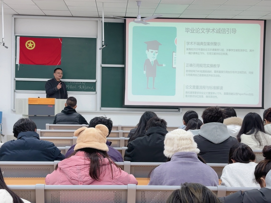 12月24日16:00,我院在宜宾校区A3-407教室先后开展考试与毕业诚信专题教育讲座及“铭记一二·九,青春勇担当”主题团日活动。活动由法学院2023级辅导员邱月主持,法学院副院长缪锌主讲,法学专业2023级1-3班全体学生参与。