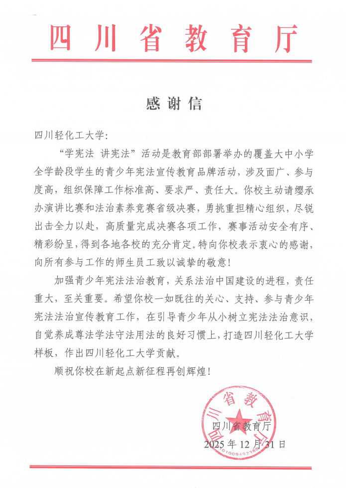 近日,四川省教育厅向我校发来感谢信,对我校成功承办第十届全国学生“学宪法 讲宪法”演讲比赛和法治素养竞赛四川赛区总决赛所作出的突出贡献,给予高度评价和衷心感谢。来信充分肯定了我校在活动组织中的主动担当、精心筹划与卓越成效,并向所有参与工作的师生员工表达了诚挚敬意。