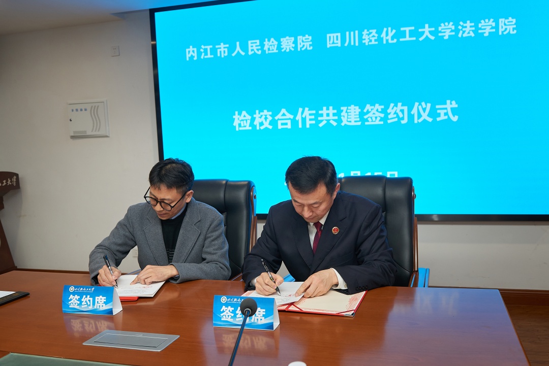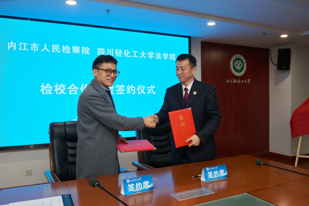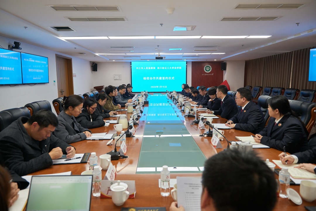 为进一步加强院校共建,拓展合作深度和广度,1月15日,四川轻化工大学法学院与内江市人民检察院举行检校合作共建签约暨授牌仪式。内江市人民检察院党组副书记、常务副检察长张阳,内江市人民检察院案件管理与法律政策研究室主任程喆、副主任林橄以及内江市两级检察院调研骨干一行赴我校法学院参加签约仪式。我校法学院党委书记邹国正,副院长(主持工作)熊德禄,副院长江凌燕、缪锌,教学科研办公室主任周欣,专职组织员郑佳敏,实践实训中心主任王海燕,法学系副主任傅一苹,劳动与社会保障系主任李鹏飞,党政办严涛以及教师代表陈和芳、张潜伟、陈昶、刘文涛、李昱辰出席签约仪式。