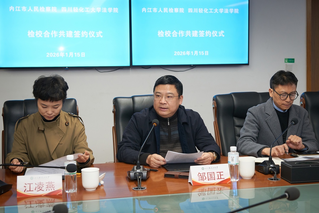 签约暨授牌仪式由邹国正主持。他对内江市人民检察院一行的到来表示热烈欢迎。他表示,检校共建合作是积极推进检察实践与理论研究、人才培养与实践需求深度融合的有益探索,不仅对内江市人民检察院强化法学理论研究、加快提升检察院队伍专业素质与司法能力提供强大助力,同时也为我校法学院开展教学、科研、实践提供平台支持,实现“资源共享、优势互补、双向教学、协同育人”人才培养新模式。