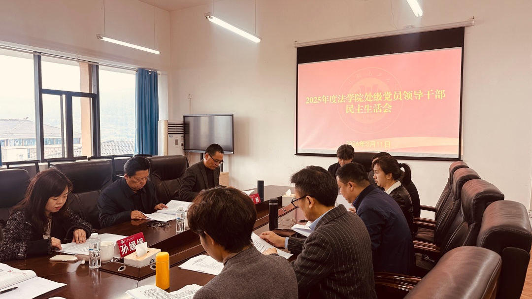 根据学校党委统一部署,3月11日上午,中共四川轻化工大学法学院委员会在宜宾校区A1-525会议室召开了2025年度处级党员领导干部民主生活会。会议紧密联系学院领导班子和个人思想、工作、作风实际,深入进行对照检查,严肃认真开展批评与自我批评。学校党委常委、副校长高小林,学校党委常委、统战部部长罗毅,学校党委组织部干部监督科科长孙媛媛到会指导,学院全体党委委员参加会议,学院党委书记邹国正主持会议。