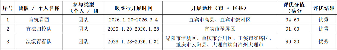 为深入贯彻资助育人理念,引导受助学生在实践中传递温暖、回馈社会,我院于2025-2026学年寒假期间组织开展了“暖冬行”资助育人系列活动。根据《关于开展2025-2026学年寒假“暖冬行”资助育人系列活动的通知》要求,经学生自主申报、材料审核、学院评审小组综合评议,拟评选出本次活动的优秀团队及优秀个人,现予以公示。