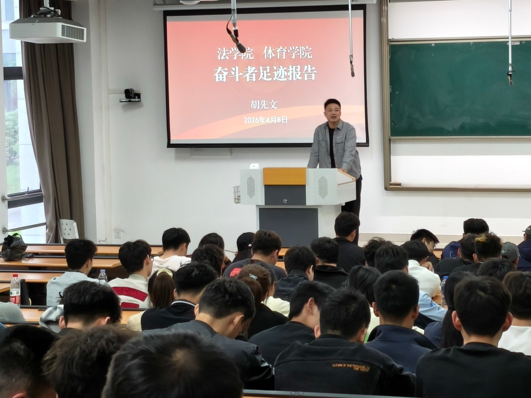 为激发学生创新创业热情,明晰职业规划方向,4月8日下午,法学院与体育学院联合举办“奋斗者足迹”报告会,特邀我校法学院行政管理专业校友、青年创业者胡先文担任主讲。会议由法学院校友会秘书长童静主持,两院百余名师生到场聆听。