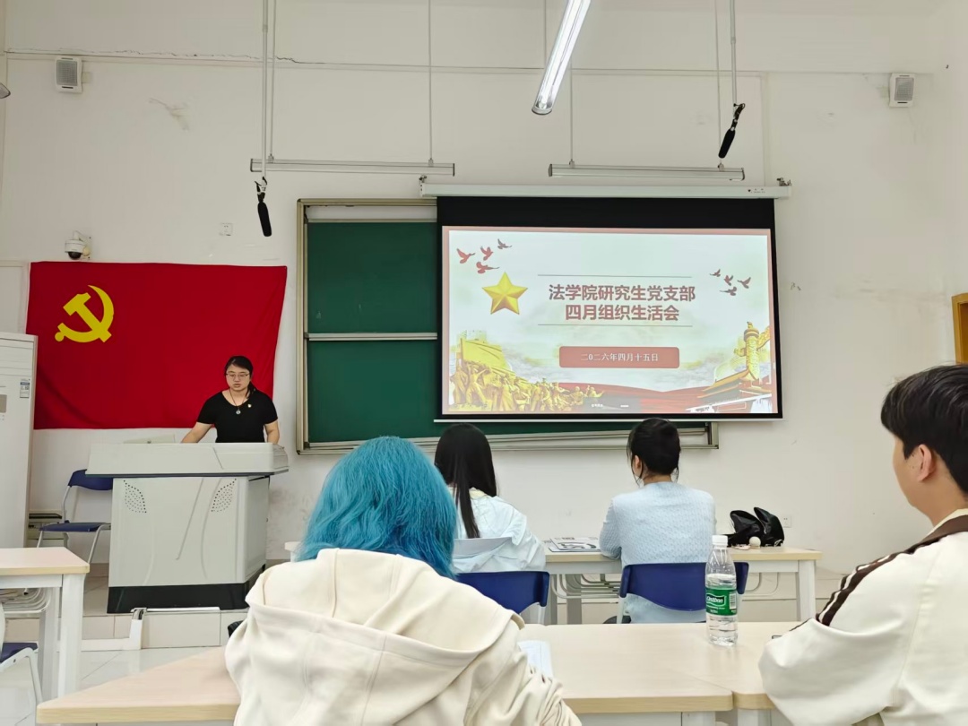 4月15日14:30,法学院研究生党支部在宜宾校区A1-212教室召开四月党组织生活会。本次会议线上线下同步进行,共有23名党员参会。